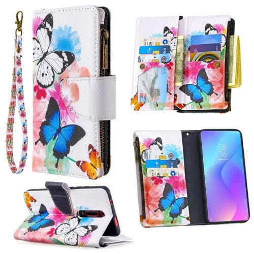 Para Xiaomi Redmi K20 / Mi 9T Patrón de Dibujo de Colores Cremallera Funda de Cuero con Tapa Horizontal con Soporte, Ranuras para Tarjetas y Billetera (Dos Mariposas)