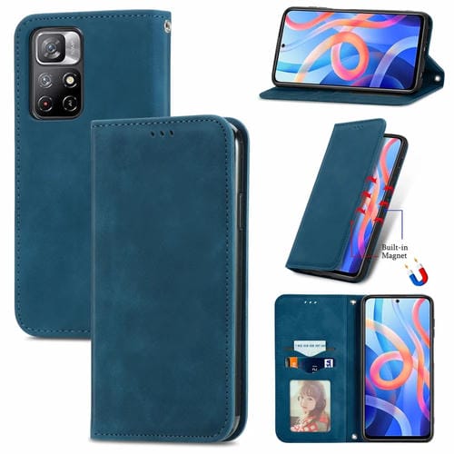 Para Xiaomi Redmi Note 11 Siente Retro Piel de Cuero Horizontal Magnético Funda de Cuero (Azul)