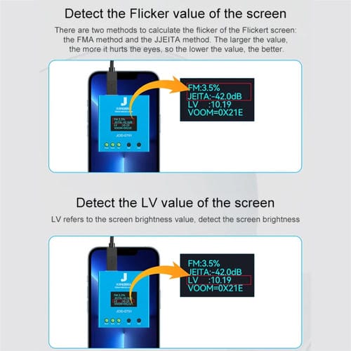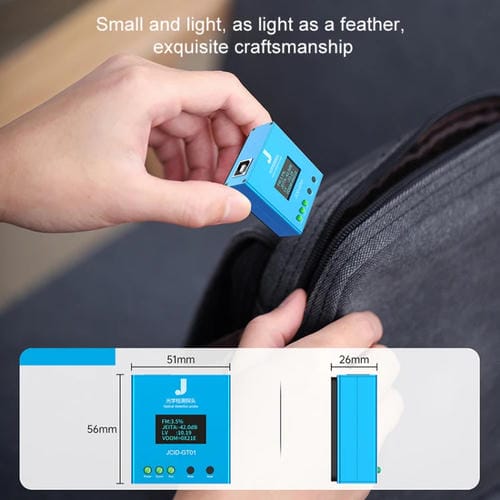 La sonda de detección Óptica JCID GT01 es una Herramienta especializada para la evaluación precisa del parpadeo y brillo (valores LV) de Pantallas, compatible con Pantallas Originales de Apple y de terceros. Diseñada para su uso con el dispositivo V1S Pro, esta sonda permite la detección en tiempo real de parámetros críticos que afectan la calidad visual y el confort ocular. Su función Principal es medir el parpadeo de Pantalla mediante dos métodos estándar (FMA y JEITA), así como determinar el nivel de brillo, facilitando así la identificación de Pantallas defectuosas o que puedan causar fatiga visual. Este instrumento es ideal para Técnicos que realizan reparaciones y control de calidad en dispositivos Móviles, ofreciendo resultados precisos incluso en modo fuera de línea.